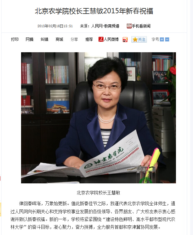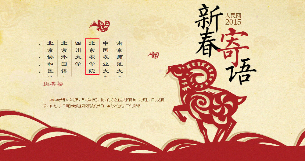 校长2015新春祝福:律回春晖渐,万象始更新。值此新春佳节之际,我谨代表北京农学院全体师生,通过人民网向长期关心和支持学校事业发展的各级领导、各界朋友、广大校友表示衷心感谢并致以新春祝福。新的一年,学校将紧紧围绕“建设特色鲜明、高水平都市型现代农林大学”的奋斗目标,凝心聚力,奋力拼搏,全力服务首都和京津冀协同发展。