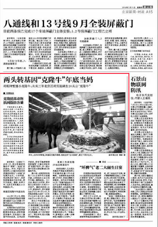 未来三年将克隆20头公转基因牛