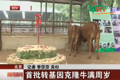 一年前,北京农学院的专家们运用克隆技术成功培育出了两只改良基因的秦川牛犊牛萌萌和妞妞,那转眼一年过去了,作为国内首例转基因的小牛犊两个小家伙该过生日了。这是一场特殊的生日派对,主角是两只刚满周岁的转基因小牛犊老大萌萌和老二妞妞,生日会上,不仅有饲养员精心准备的饲料蛋糕,还给两个小家伙带上了喜庆的大红花,据了解,两只小牛犊的代孕妈妈都是初产母牛,但萌萌的妈妈在生产后拒绝喂养,所以农学院动物科学院的研究生们就当起了萌萌的临时奶爸。