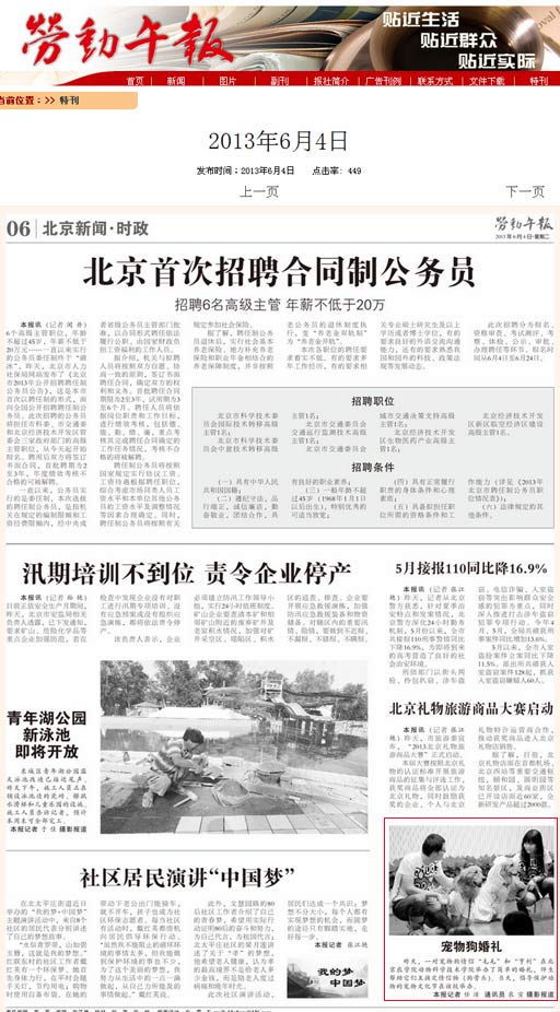 5月29日,一对宠物狗情侣“毛毛”和“亨利”在北京农学院动物图书馆举办了简单的婚礼,师生帮助它们互换定情信物(狗骨头)。当天,倡导保护动物的宠物文化节在该校举办。