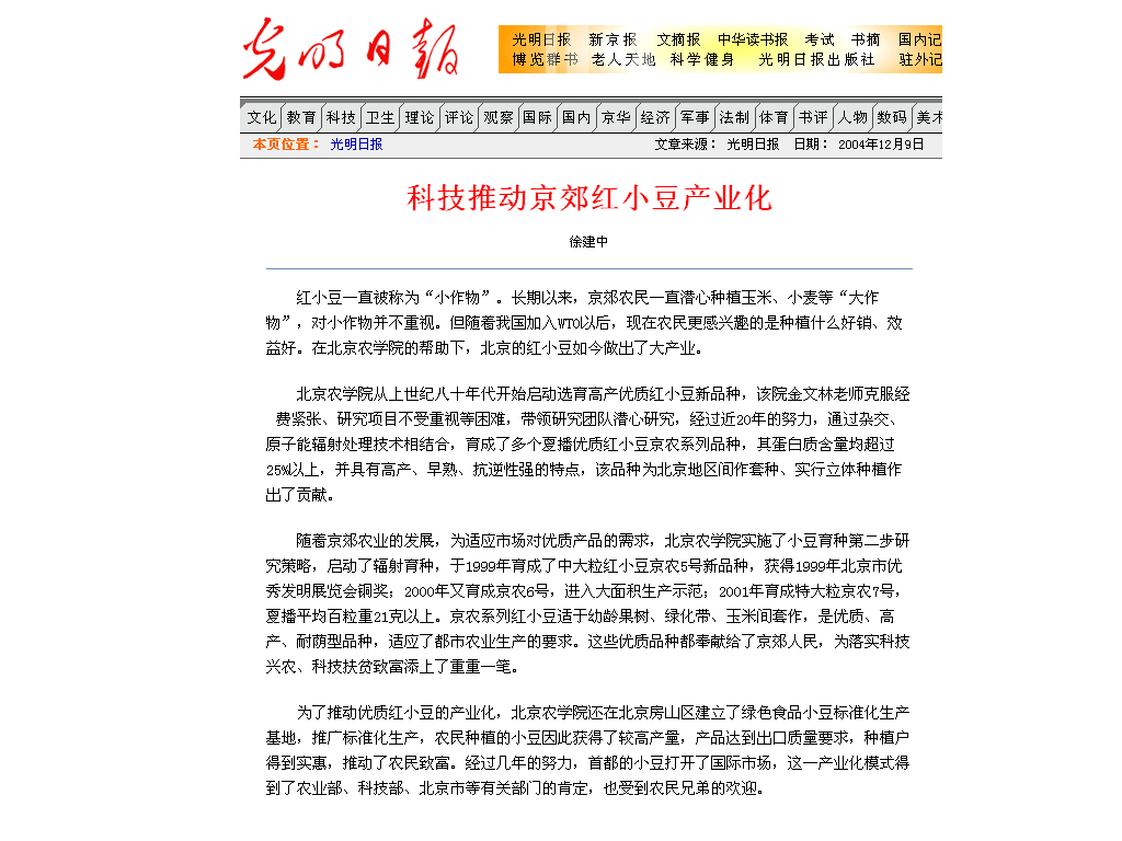 为了推动优质红小豆的产业化,北京农学院还在北京房山区建立了绿色食品小豆标准化生产基地,推广标准化生产,农民种植的小豆因此获得了较高产量,产品达到出口质量要求,种植户得到实惠,推动了农民致富。经过几年的努力,首都的小豆打开了国际市场,这一产业化模式得到了农业部、科技部、北京市等有关部门的肯定,也受到农民兄弟的欢迎。