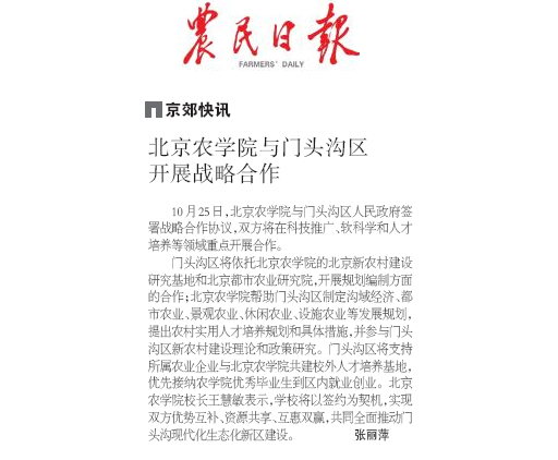 10月25日,北京农学院与门头沟区人民政府签署战略合作协议,双方将在科技推广、软科学和人才培养等领域重点开展合作。