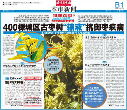市林保站陶万强站长告诉记者,今年,由市园林绿化局林保站、北京林科院、北京农学院共同承担的枣疯病科研课题开展了一年的工作,将在年底结题,而从课题中林保站总结出了四招对付枣疯病:首先,他们使用了河北林业大学研制出的“祛疯灵”,其治疗枣疯病的效果不错。而在入冬前,林保站已经在城区对400棵古枣树进行了祛疯灵输液,其原理和人输液相同,在枣树上吊输液袋,将祛疯灵慢慢输入到树木的组织中,让药剂杀灭病菌。林保站也将继续观察这些枣树,在明年还将继续进行输液,以确保古枣树的健康;其次,选育优良的抗枣疯病品种。目前,园林科研部门已经选育出抗病的星光和耐病的唐星、阜星等数个品种,这些品种不仅果实糖度高、产量高,而且能有效地抵抗枣疯病,保证枣树的健康;再次,林保站刚刚完成了枣疯病媒介昆虫的剿杀。枣疯病通过凹缘菱纹叶蝉、橙带拟菱纹叶蝉和红闪小叶蝉等传播,它们在病树上吸食后,再取食健康树木,传毒媒介昆虫和疯病树同时存在,是枣疯病蔓延的必备条件,所以,林保站进行害虫调查后,在这些害虫的高发区进行了集中灭杀,取得了好的效果;最后,园林部门还要求各区县彻底铲除重病树,及时剪除病枝,切断传病之源。同时,加强枣树管理,注意加强水肥管理,对土质条件差的要增施有机肥、磷钾肥料,疏松土壤,改良土壤性质,提高土壤肥力,增强树体的抗病能力,以减少枣疯病的危害。