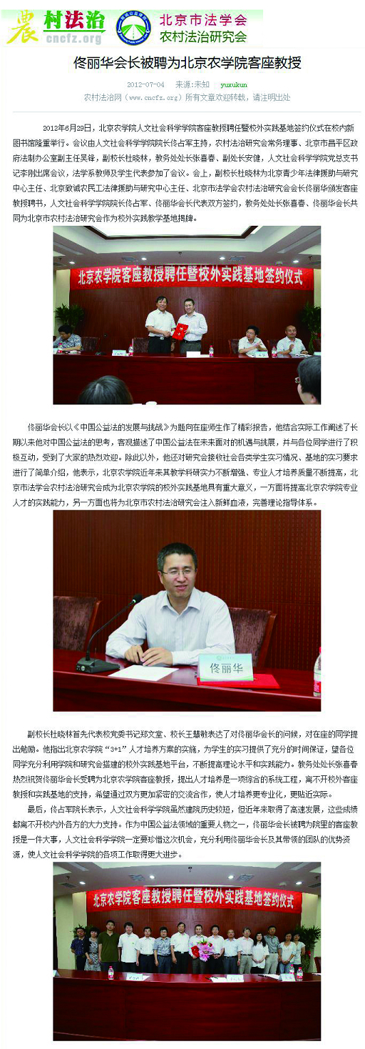 2012年6月29日,北京农学院人文社会科学学院客座教授聘任暨校外实践基地签约仪式在校内新图书馆隆重举行。会议由人文社会科学学院院长佟占军主持,农村法治研究会常务理事、北京市昌平区政府法制办公室副主任吴锋,副校长杜晓林,教务处处长张喜春、副处长安健,人文社会科学学院党总支书记李刚出席会议,法学系教师及学生代表参加了会议。会上,副校长杜晓林为北京青少年法律援助与研究中心主任、北京致诚农民工法律援助与研究中心主任、北京市法学会农村法治研究会会长佟丽华颁发客座教授聘书,人文社会科学学院院长佟占军、佟丽华会长代表双方签约,教务处处长张喜春、佟丽华会长共同为北京市农村法治研究会作为校外实践教学基地揭牌。