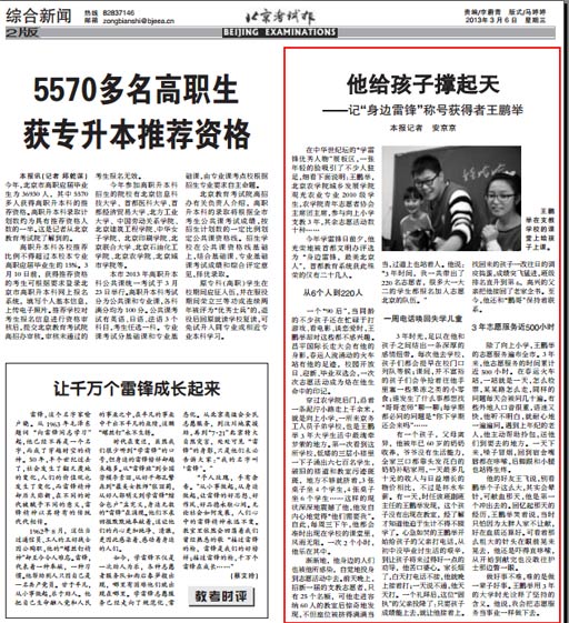 今年学雷锋日前夕,他光荣地被首都文明办评选为“身边雷锋,最美北京人”,首都教育系统获此殊荣的仅有二十几人。