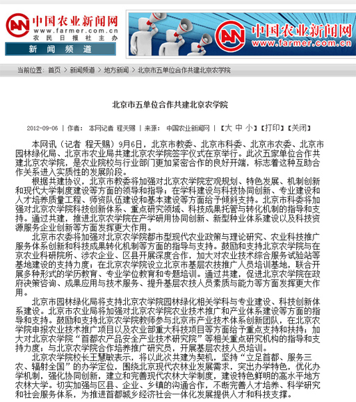 本网讯(记者 程天赐)9月6日,北京市教委、北京市科委、北京市农委、北京市园林绿化局、北京市农业局共建北京农学院签字仪式在京举行。此次五家单位合作共建北京农学院,是农业院校与行业部门更加紧密合作的良好开端,标志着这种互助合作关系进入实质性的发展阶段。