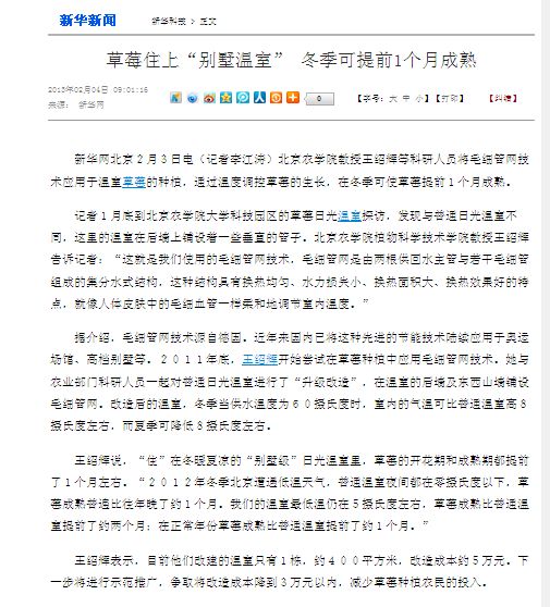 新华网北京2月3日电(记者李江涛)北京农学院教授王绍辉等科研人员将毛细管网技术应用于温室草莓的种植,通过温度调控草莓的生长,在冬季可使草莓提前1个月成熟。