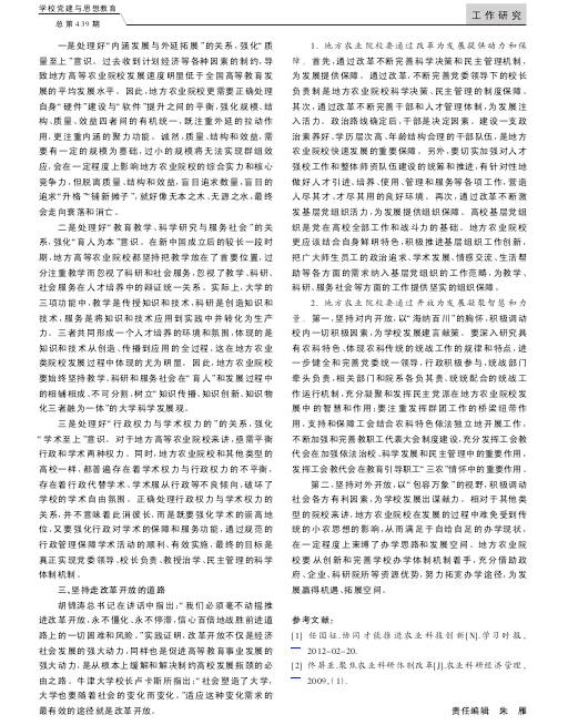 三是处理好“行政权力与学术权力的”的关系,强化“学术至上”意识。对于地方高等农业院校来讲,亟需平衡行政和学术两种权力。同时,地方农业院校和其他类型的高校一样,都普遍存在着学术权力与行政权力的不平衡,存在着行政代替学术、学术服从行政等不良倾向,破坏了学校的学术自由氛围。正确处理行政权力与学术权力的关系,并不意味着此消彼长,而是既要强化学术的崇高地位,又要强化行政对学术的保障和服务功能,通过规范的行政管理保障学术活动的顺利、有效实施,最终的目标是真正实现党委领导、校长负责、教授治学、民主管理的科学体制机制。