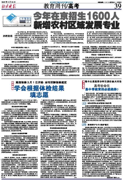 范双喜:2009年北京农学院预计在京投放招生计划1600人,其中本科1200人、专科400人,在京招生计划约占学校招生计划总数的85%左右。今年学校新增本科招生专业1个,即农村区域发展,至此在京招生本科专业数将达到23个。