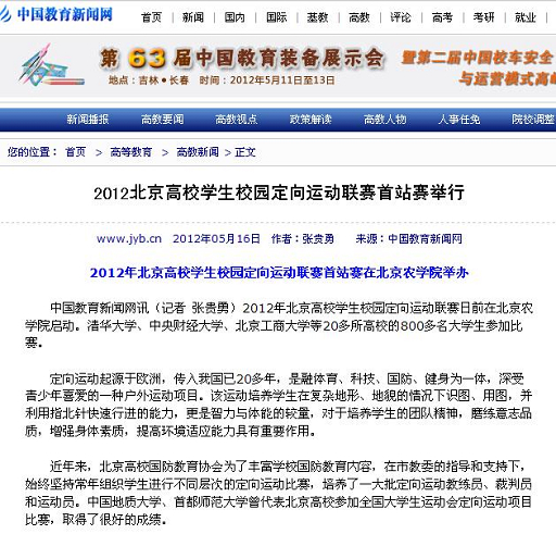 中国教育新闻网讯(记者张贵勇)2012年北京高校学生校园定向运动联赛日前在北京农学院启动。清华大学、中央财经大学、北京工商大学等20多所高校的800多名大学生参加比赛。