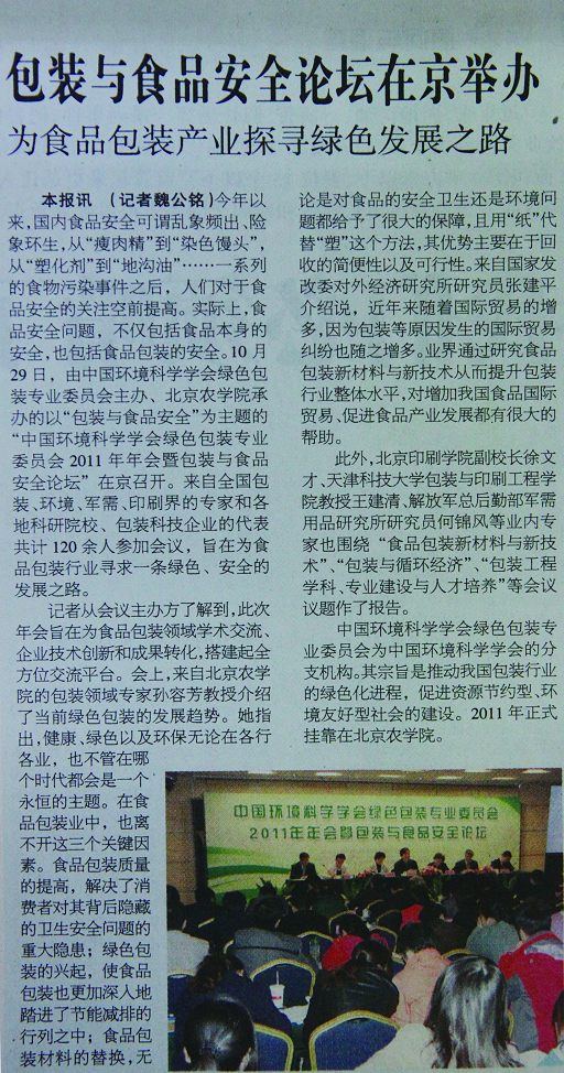 本报讯(记者魏公铭)今年以来,国内食品安全可谓乱象频出、险象环生,从“瘦肉精”到“染色馒头”,从“塑化剂”到“地沟油”……一系列的食物污染事件之后,人们对于食品安全的关注空前提高。实际上,食品安全问题,不仅包括食品本身的安全,也包括食品包装的安全。10月29日,由中国环境科学学会绿色包装专业委员会主办、北京农学院承办的以“包装与食品安全”为主题的“中国环境科学学会绿色包装专业委员会2011年年会暨包装与食品安全论坛”在京召开。来自全国包装、环境、军需、印刷界的专家和各地科研院校、包装科技企业的代表共计120余人参加会议,旨在为食品包装行业寻求一条绿色、安全的发展之路。
