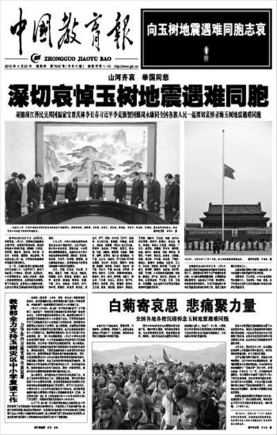 陕西各高校校园网主页面变为黑白色,各高校停止了一切公共娱乐活动,师生纷纷以不同方式向玉树灾区表达哀思,寄托祝福。