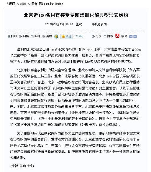 为了更好地实现在涉农纠纷方面多元主体的良性互动,更多地重视律师等专业力量在涉农纠纷中的重要作用,发挥双方的资源优势,北京市法学会农村法治研究会与丰台区长辛店镇政府达成合作,并在会上进行了双方的签字挂牌仪式,双方共同在长辛店镇政府建立首都农村法治创新研究基地,此举在解决涉农纠纷工作方面是一种有意义的探索和创新。