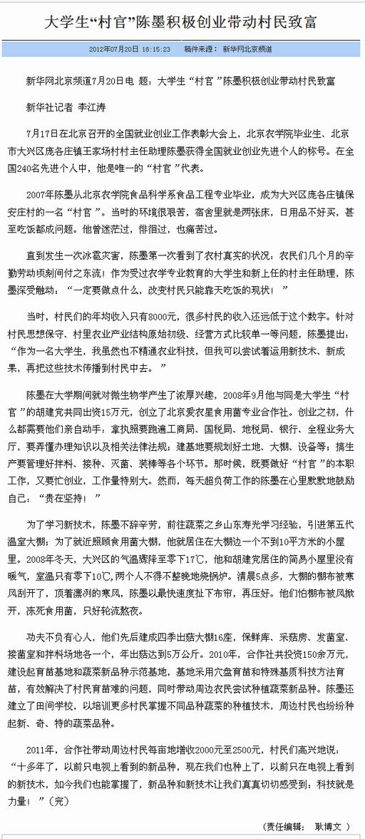 7月17日在北京召开的全国就业创业工作表彰大会上,北京农学院毕业生、北京市大兴区庞各庄镇王家场村村主任助理陈墨获得全国就业创业先进个人的称号。在全国240名先进个人中,他是唯一的“村官”代表。