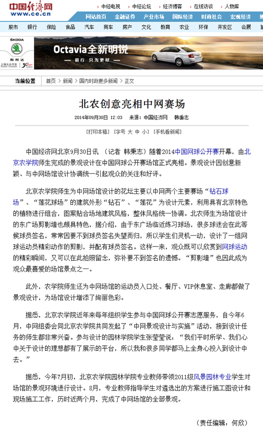 中国经济网北京9月30日讯 (记者 韩秉志)随着2014中国网球公开赛开幕,由北京农学院师生完成的景观设计在中国网球公开赛场馆正式亮相。景观设计因创意新颖、与中网场馆设计协调统一引起观众的关注和好评。