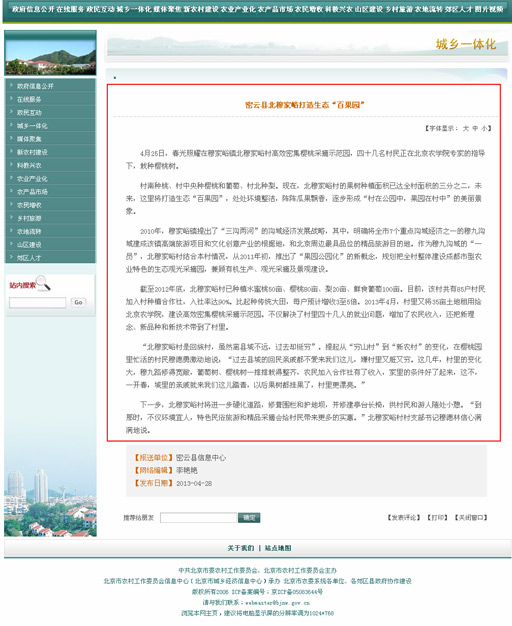 下一步,北穆家峪村将进一步硬化道路,修葺围栏和护地坝,并修建亭台长椅,供村民和游人随处小憩。“到那时,不仅环境宜人,特色民俗旅游和精品采摘会给村民带来更多的实惠。”北穆家峪村村支部书记穆德林信心满满地说。