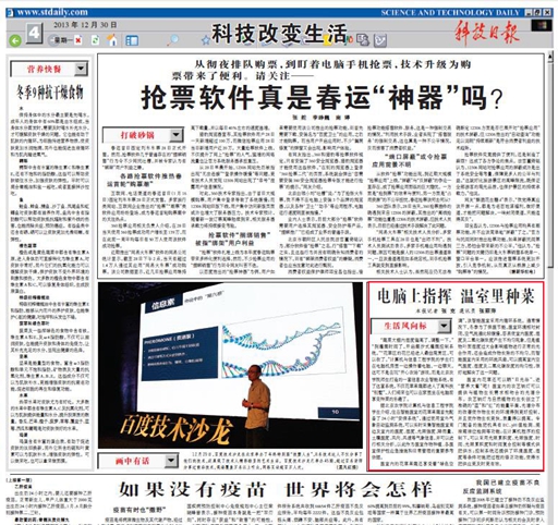 “蔬菜大棚内湿度偏高了,调整一下。”“到灌溉时间了,开启潮汐式灌溉控制系统。”“花草区的花已经进入最佳观赏区,可以收了。”计算机与信息工程学院的学生们在电脑机房里一边操作着电脑,一边聊天。这可不是在玩“开心农场”游戏,而是北京农学院师生打造的一套信息农业智能系统,有了这套系统,不仅花草果蔬都进入了高科技“别墅”,人们将来也可以在家里坐在电脑前享受种菜的乐趣了。