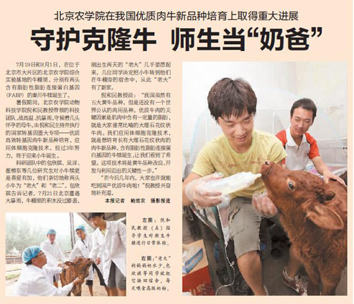 暑假期间,北京农学院动物科技学院倪和民教授带领的科技团队,战高温、抗暴雨,守候着几头怀孕的母牛。由倪和民主持并执行的国家转基因重大专项——优质高效转基因肉牛新品种培育,应用体细胞克隆技术,经过3年努力,终于迎来小牛诞生。