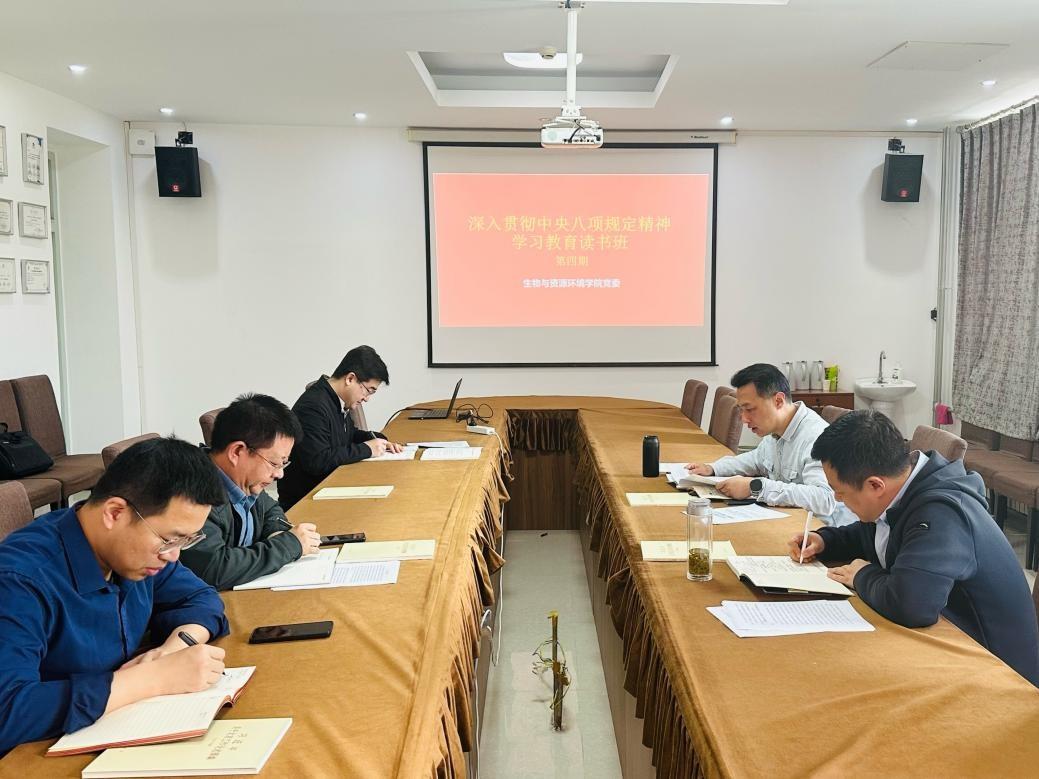 4月17日,生物与资源环境学院党委组织召开深入贯彻中央八项规定精神学习教育读书班第四次集体学习暨理论学习中心组交流研讨会,学院领导班子、党委委员参加学习,会议由学院党委书记杨宝东主持。