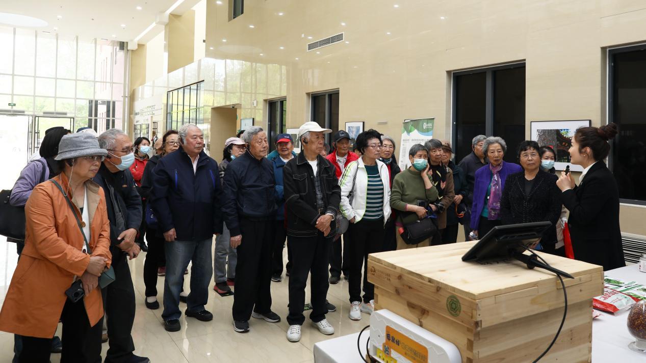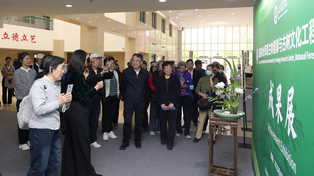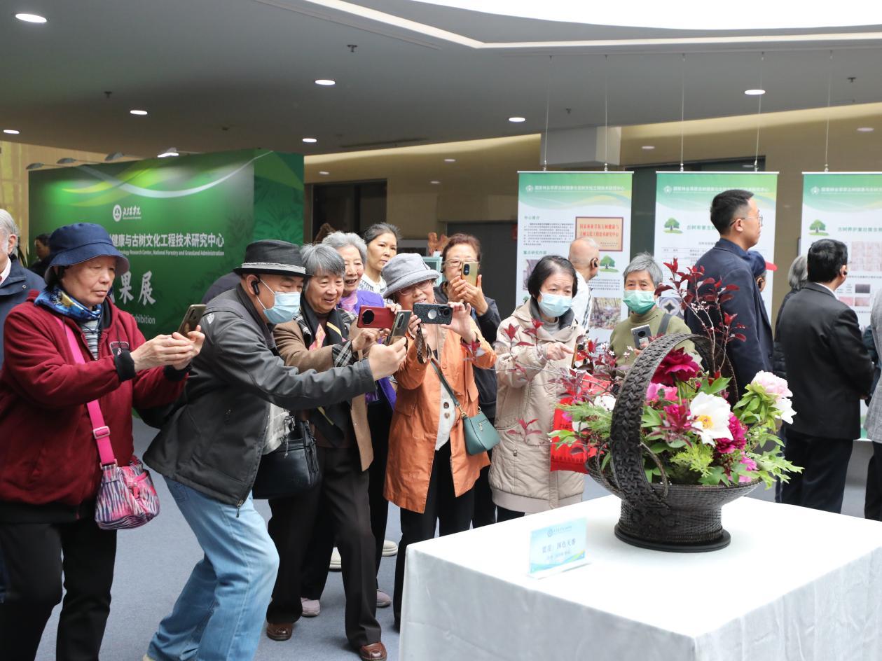 在学校园林楼一层,老同志们观看了“三山五园展”“古树成果展”“插花艺术展”“科技成果展”,深入了解学校助力古树健康与古树文化事业发展、助力首都花园城市建设现代种业之都建设的做法和取得的成效。