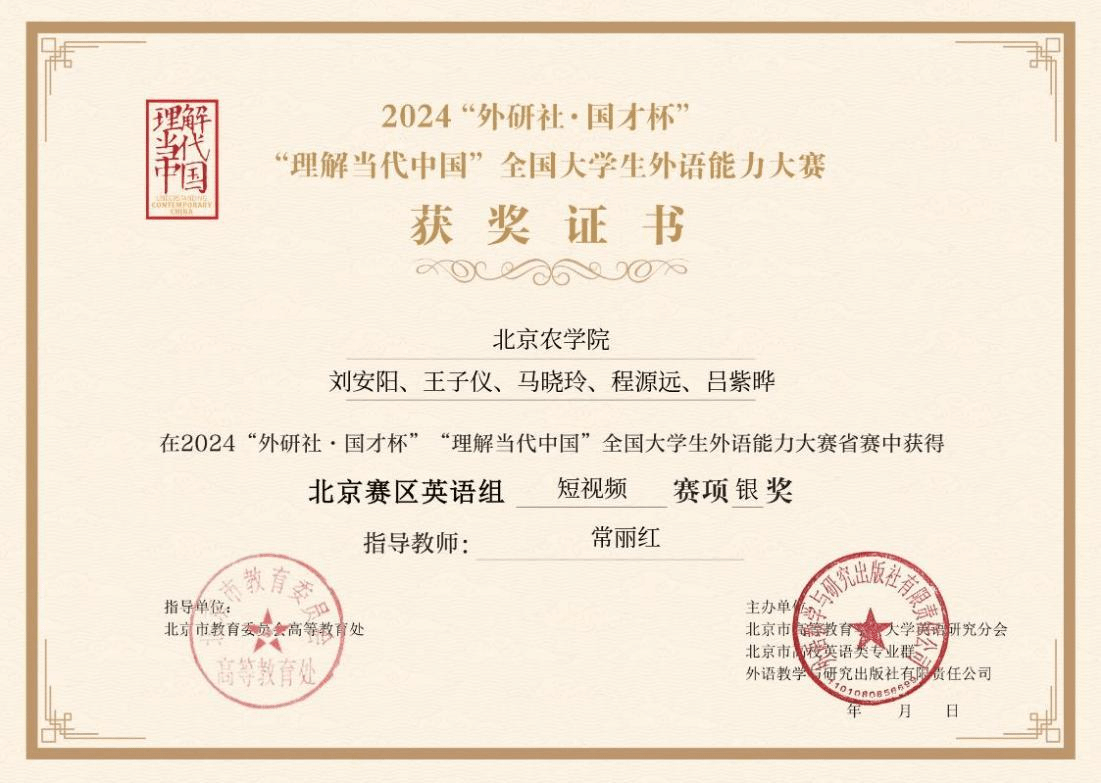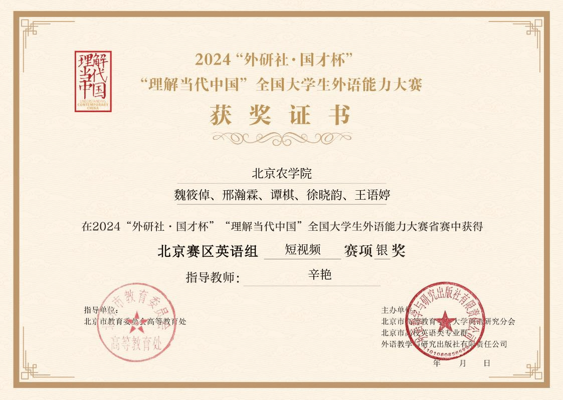近日,2024“外研社·国才杯”“理解当代中国”全国大学生外语能力大赛北京赛区英语组短视频比赛结果公布,我校学生在北京68所高校的1000余名选手中脱颖而出,荣获银奖。