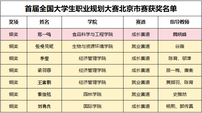 近日,北京市教育委员会公布首届全国大学生职业规划大赛北京市赛评比结果。经过激烈角逐,我校共有7名同学获奖,其中银奖1项,铜奖6项。