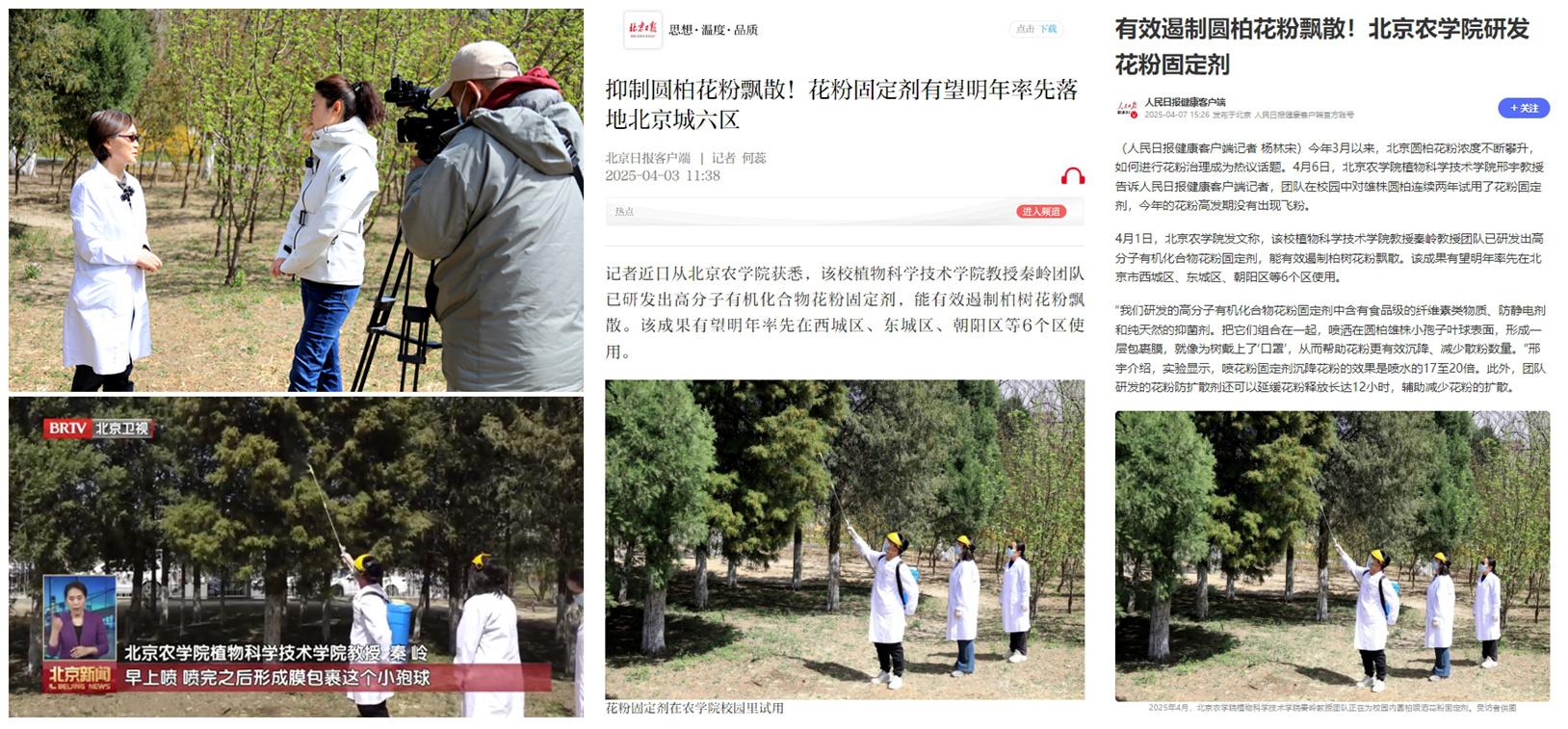 今年春天,圆柏花粉频频冲上热搜,北京有圆柏雄株两百多万棵,为了有效减轻圆柏花粉给市民生活带来的困扰,我校秦岭教授团队围绕遏制柏树花粉飘散进行了科技攻关,目前已取得较好成效。人民日报健康客户端、光明网、北京电视台、北京日报、新京报等20多家媒体对此进行了报道。