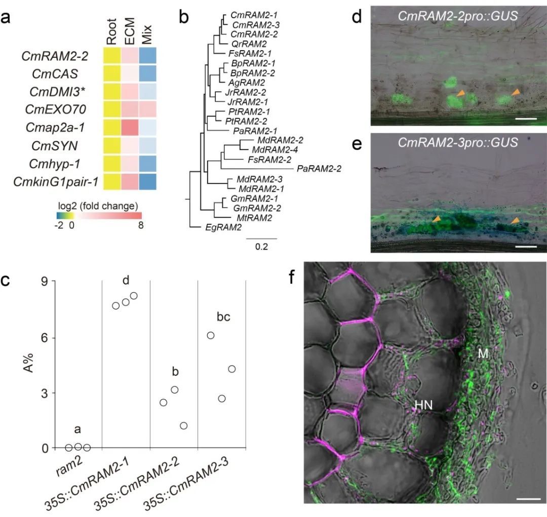 (d)和CmRAM2-3pro::GUS (e)的表达模式。(f)ECM共生界面积累脂肪酸。