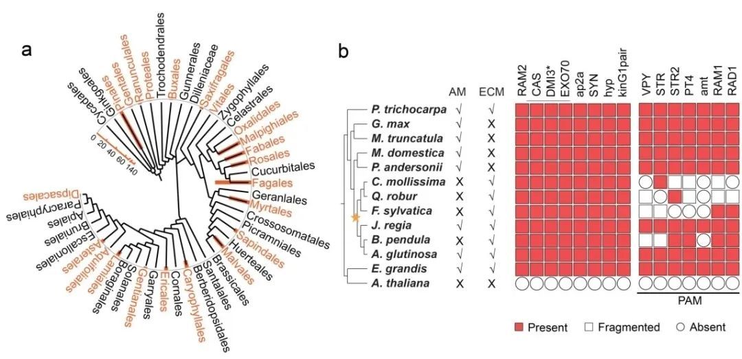 图1. AM保守基因在ECM宿主中的存在情况。(a)ECM宿主分布在24个目中。
