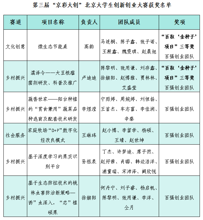 近日,北京市教育委员会、北京市人力资源和社会保障局、北京市发展和改革委员会联合公布了第三届“京彩大创”北京大学生创新创业大赛获奖名单,我校6支学生团队荣获北京市“百强创业团队”称号,其中“微生态节能桌”“濡泽令——大豆根瘤菌剂研发、科普及推广”2支团队晋级决赛并获得三等奖,被列为北京大学生创新创业“百粒‘金种子’项目”,学校荣获优秀组织奖。