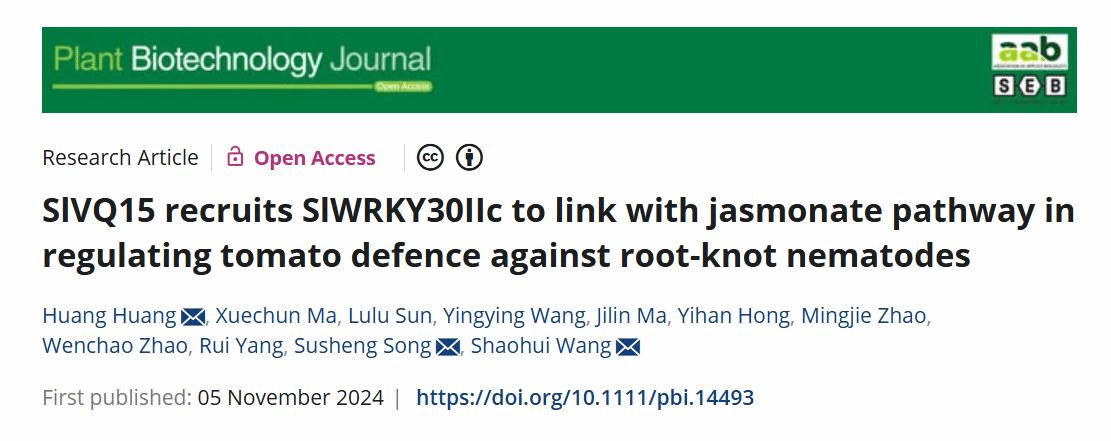 团队在Plant Biotechnology Journal发表了题为“SlVQ15 recruits SlWRKY30IIc to link with jasmonatepathway in regulating tomato defence against root-knot nematodes”的研究论文。该论文揭示了SlVQ15招募转录因子SlWRKY30IIc,偶联茉莉素途径调控番茄应对根结线虫入侵的分子机制,为茄科植物的抗性育种提供新的思路。