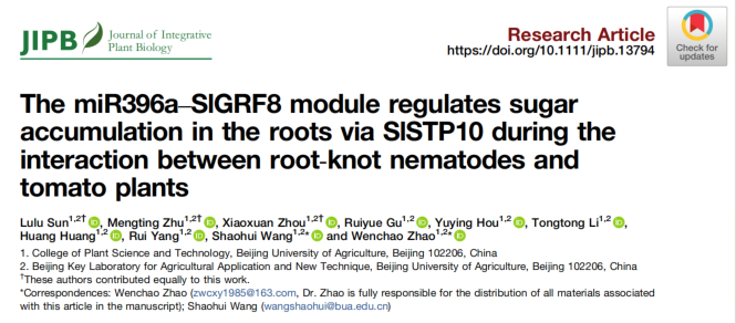 团队在Journal of Integrative Plant Biology在线发表了题为“The miR396a-SlGRF8 module regulates sugar accumulation in the roots via SlSTP10 during the interaction between root-knot nematodes and tomato plants”的研究论文(doi:http://doi.org/10.1111/jipb.13794)。该研究深入揭示了番茄与根结线虫相互作用中糖分竞争的分子机制,为探索植物-线虫互作机理奠定了基础。通过调控miR396a-SlGRF8-SlSTP10 模块,可以有效调节番茄根系糖分分配,从而提高番茄对根结线虫的抗性,为线虫防治提供新的思路。
