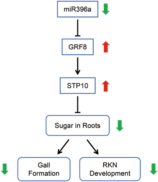 文章提出了一个潜在的调控模型,描述了番茄与根结线虫(RKN)相互作用过程中,由miR396a–SlGRF8–SlSTP10模块介导的糖分配机制。根结线虫感染番茄根系后,会降低miR396a的表达,并在转录水平上上调SlGRF8和SlSTP10基因的表达,降低根系可溶性糖含量,进而抑制根结线虫的生长发育,提高番茄的抗根结线虫能力。