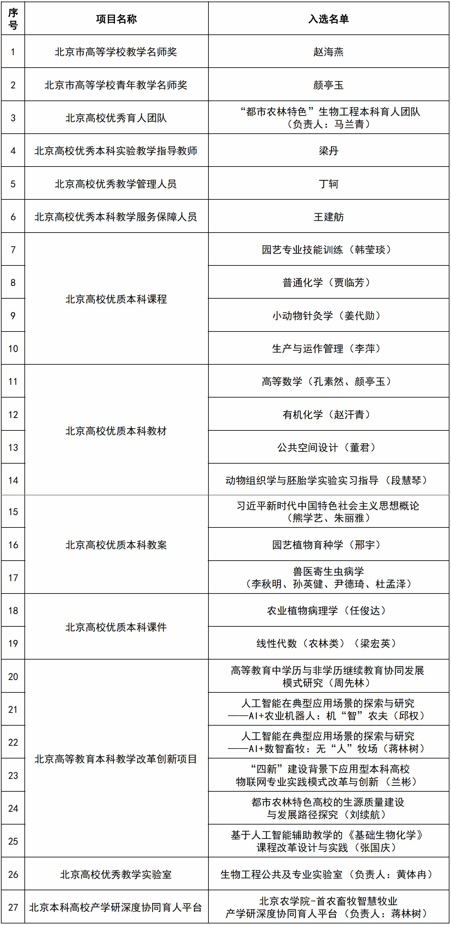 近日,北京市教委发布了《北京市教育委员会关于公示2024年北京高校本科教学项目建设评选结果的通知》,我校27个项目入选,创历史新高,其中北京市高等学校教学名师奖1人,北京市高等学校青年教学名师奖1人,北京高校优秀育人团队1个,北京高校优秀本科实验教学指导教师1人,北京高校优秀教学管理人员1人,北京高校优秀本科教学服务保障人员1人,北京高校优质本科课程4项,北京高校优质本科教材4项,北京高校优质本科教案3项,北京高校优质本科课件2项,北京高等教育本科教学改革创新项目6项,北京高等学校优秀教学实验室1个,北京本科高校产学研深度协同育人平台1个。