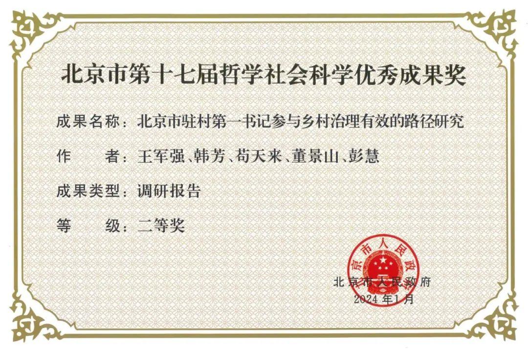 近日,北京市第十七届哲学社会科学优秀成果奖评选结果正式公布,我校文法与城乡发展学院王军强副教授团队撰写的调研报告《北京市驻村第一书记参与乡村治理有效的路径研究》荣获二等奖。