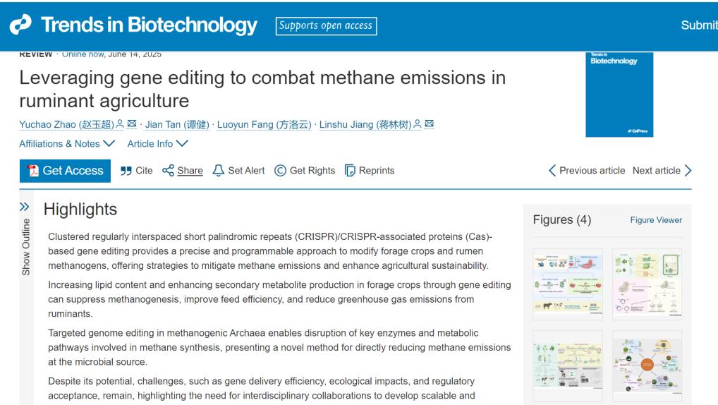 2025年6月14日,北京农学院奶牛营养学北京市重点实验室蒋林树教授团队在Cell Press旗下期刊Trends in Biotechnology(中科院1区TOP期刊,IF=14.3)发表了题为“Leveraging gene editing to combat methane emissions in ruminant agriculture”的综述论文,系统阐述了利用CRISPR基因编辑技术减少反刍动物甲烷排放的前沿策略。该综述聚焦于两个核心方向:饲草改良与瘤胃微生物重塑,提出通过精准编辑植物(次级代谢产物)和微生物(产甲烷古菌)基因,实现反刍动物源头控排,为低碳畜牧业发展提供新思路。