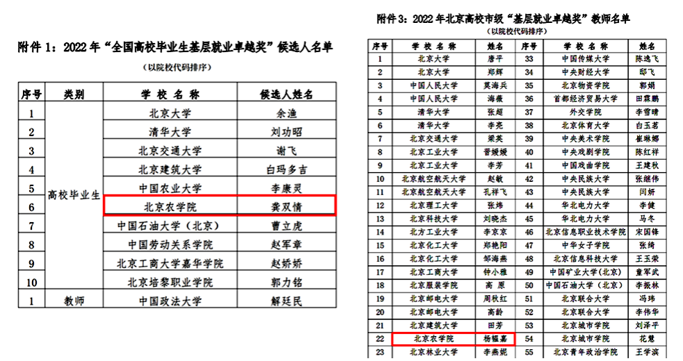 近日,北京市教委北京高校就业创业指导中心公布2022年高校毕业生基层就业卓越奖候选人推荐评选结果。经高校推荐、专家评审,我校园林学院2012届毕业生龚双情被推荐为“全国高校毕业生基层就业卓越奖”候选人,植物科学技术学院辅导员杨韫嘉被评为北京市级“基层就业卓越奖”教师。