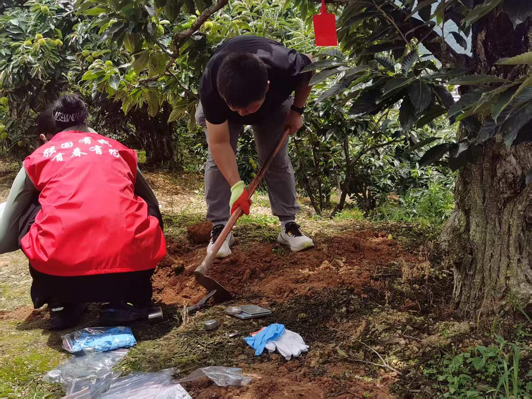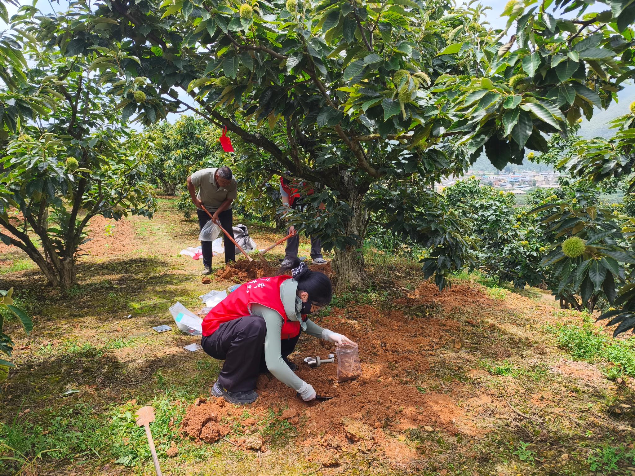 云南省作为我国板栗成熟期最早的产区,板栗年产量达20多万吨,占全国总产量的8.56%,在全国板栗产业布局中占据重要地位。我校选育的国审板栗良种“京暑红”因成熟期早、品质优良,深受当地栗农认可与青睐。在板栗示范园现场,实践团采集引种的北方品种“京暑红”“燕山早丰”的果实样本及土壤样品,通过后续实验室数据分析,深入探究主栽品种在南北方不同生态条件下的结果习性和品质差异,为板栗的引种提供科学依据。