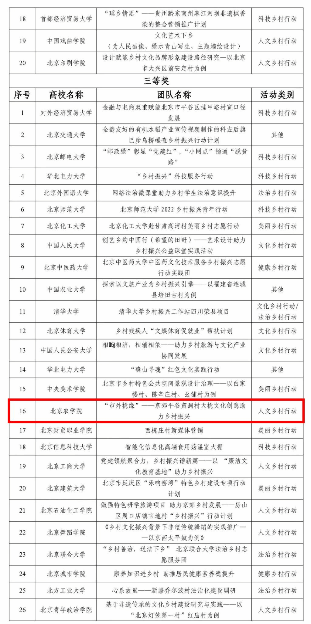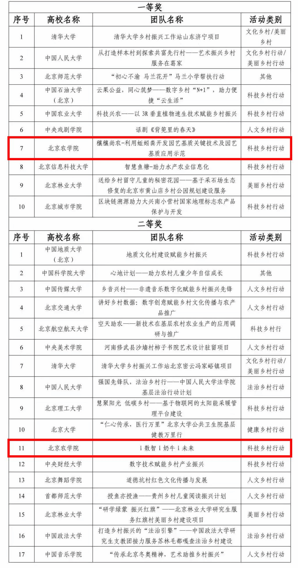 近日,北京市学校思想政治工作中心发布了《关于首都高校师生服务“乡村振兴”行动计划成果评审结果的公告》。经过学校推荐、专家评审,共评选一等奖10项、二等奖20项、三等奖30项、优秀奖38项。我校申报的7支团队全部获奖,其中一等奖1项,二等奖1项,三等奖1项,优秀奖4项,获奖数量在首都高校居于首位。