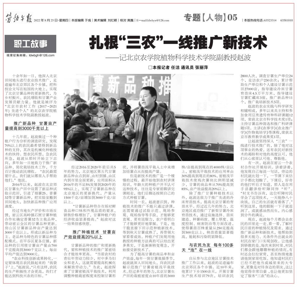 十余年如一日,他深入北京田间地头进行农业技术推广,足迹遍布北京郊区各个乡镇,把科技论文写在祖国的大地上,实现了北京甘薯品种的更新换代,为乡村振兴、农民增收和甘薯产业发展贡献力量。他就是被评为“北京市农村工作(2017-2021年)先进个人”的北京农学院植物科学技术学院副教授赵波。