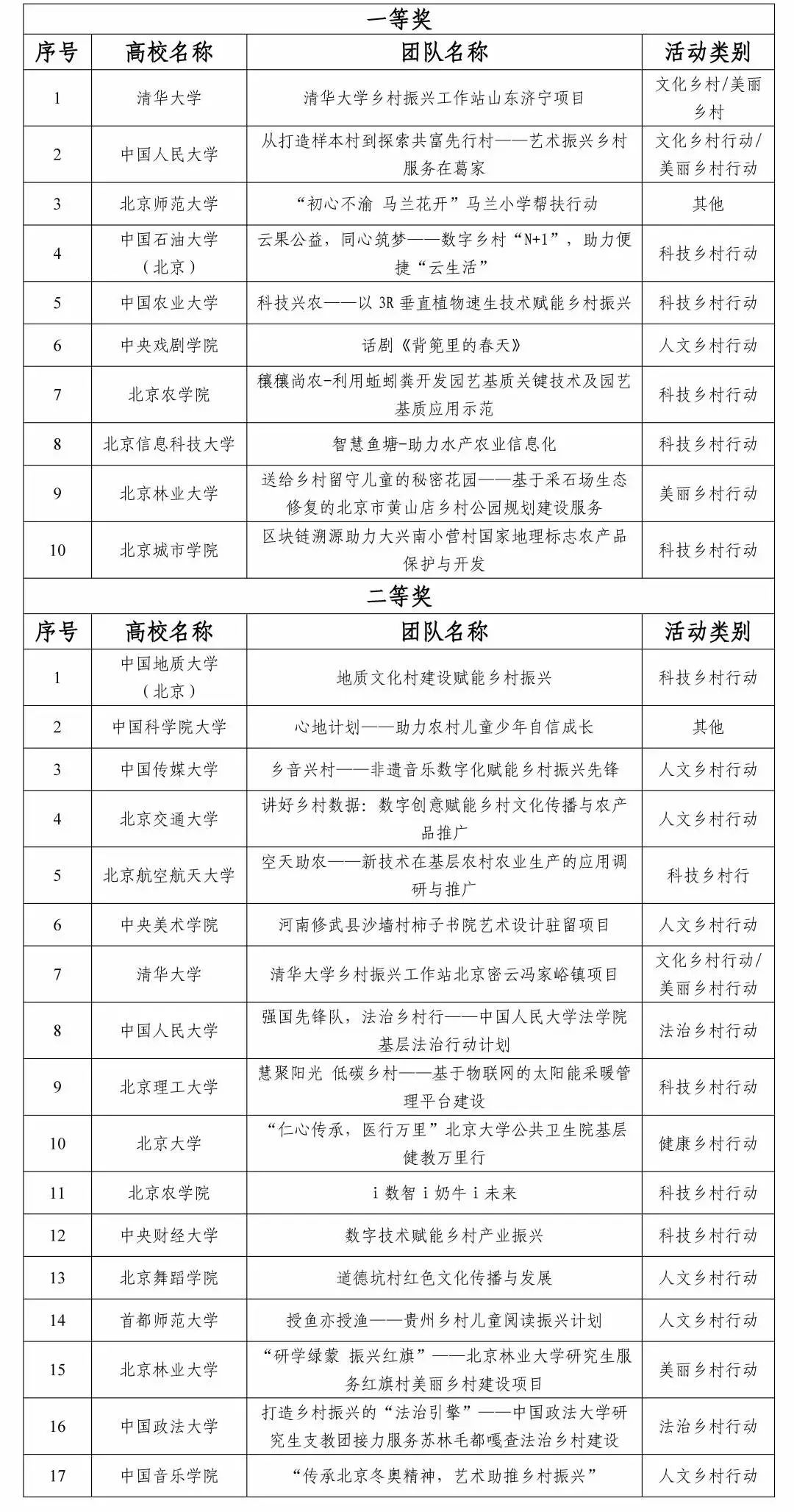 今年6月,市委教育工委、市教委启动首都高校师生服务“乡村振兴”行动计划,遴选优秀团队,奔赴全国22个省、市、自治区的119个乡村开展实践,助力乡村发展,取得显著效果。为进一步凝练经验、激励先进,经高校推荐、专家评审,共评选一等奖10项、二等奖20项、三等奖30项、优秀奖38项,现将获奖名单予以公布。