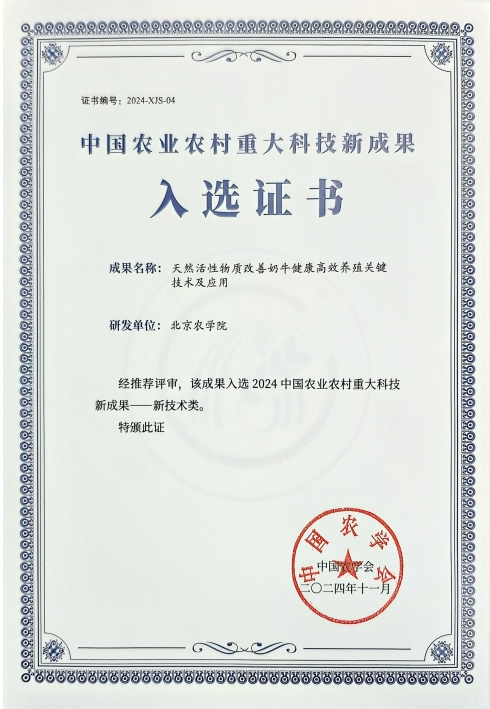“天然活性物质改善奶牛健康高效养殖关键技术及应用”由蒋林树主持,联合中国科学院东北地理与农业生态研究所、北京三元种业科技股份有限公司、现代牧业集团有限公司等单位共同完成。经过初选、复选、终选等多轮严格遴选程序,成功入选2024中国农业农村重大新技术。