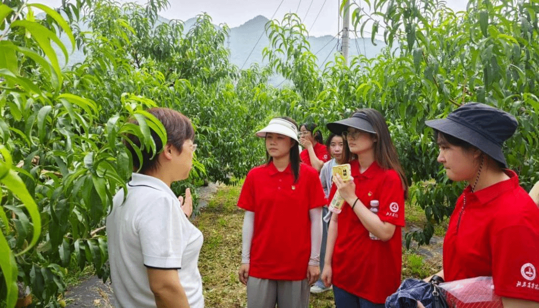 暑期植物科学技术学院曹庆芹教授、张卿副教授、张德凤副教授多次带领实践团成员深入平谷区大华山镇挂甲峪村和苏子峪村,与镇、村领导和技术人员探讨平谷大桃免套袋管理和苏子峪蜜枣种植遇到的技术难题,并结合实际提出解决方案。