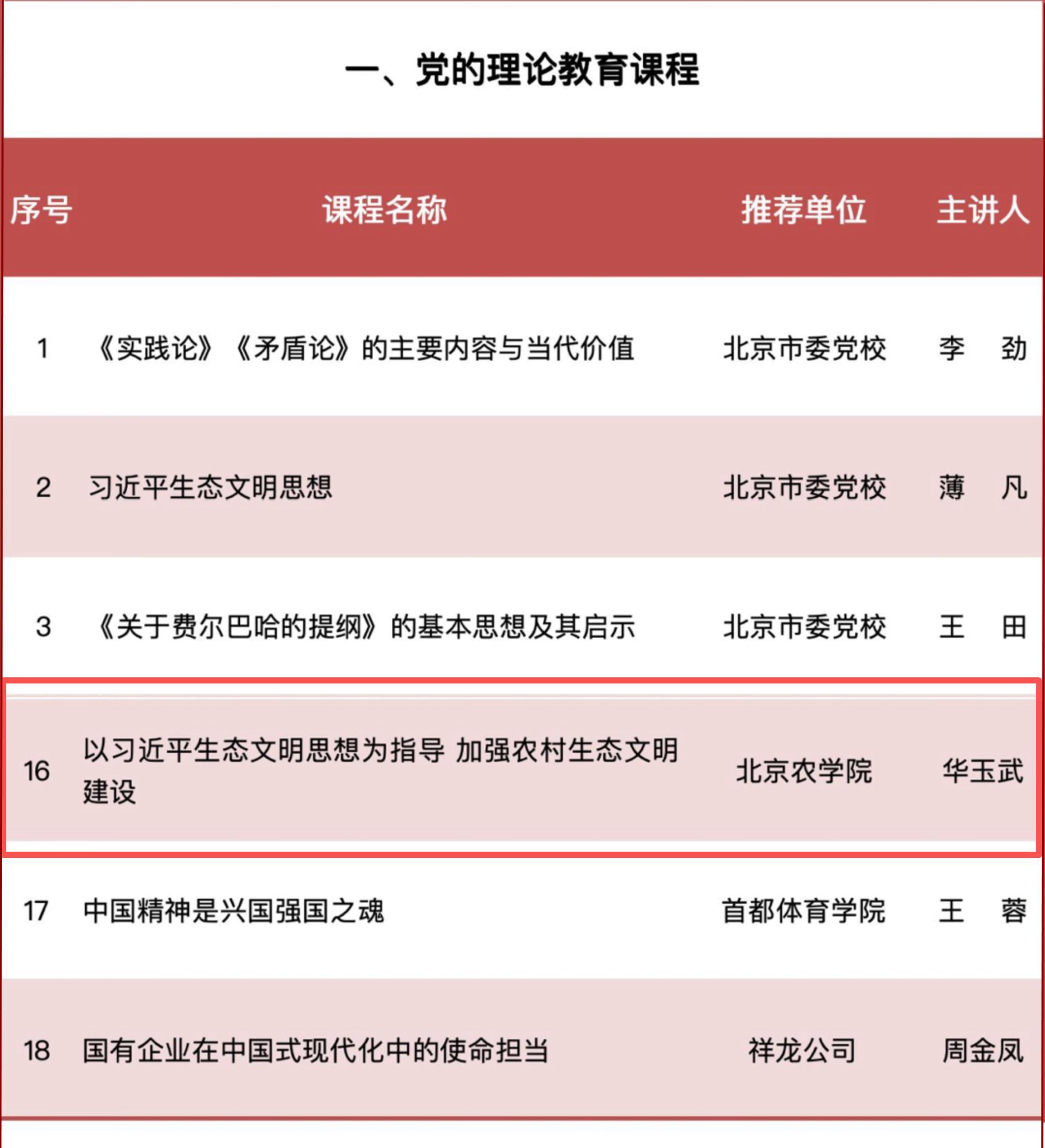 近日,北京市委组织部公布《北京市干部教育培训好课程推荐目录》,确定45门课程为“全市干部教育培训好课程”。我校马克思主义学院华玉武教授主讲的《以习近平生态文明思想为指导 加强农村生态文明建设》入选《北京市干部教育培训好课程推荐目录》。