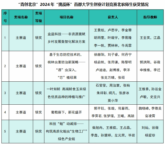 近日,“青创北京”2024年“挑战杯”首都大学生创业计划竞赛落下帷幕,我校学生作品在本届竞赛中获金奖3项、银奖8项、铜奖9项,学校获评“优秀组织单位”。