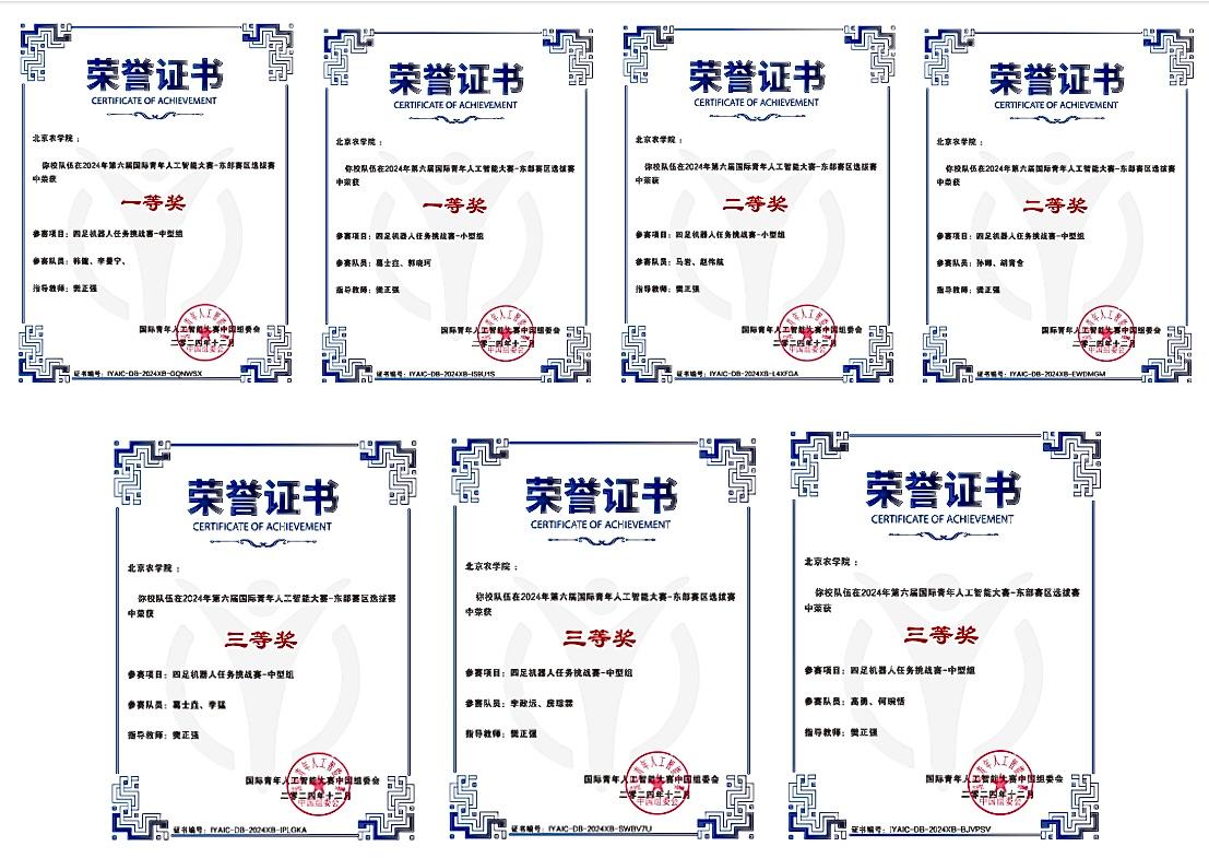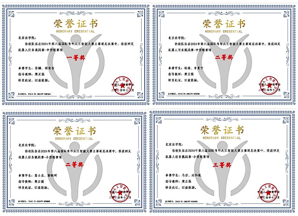 近日,第六届国际青年人工智能大赛总决赛在雄安新区举行。来自北京大学、清华大学、上海交通大学、西安交通大学等全国多所高校的300余名学子在九个赛道展开激烈角逐。我校智能科学与工程学院樊正强老师带领的参赛团队在区域选拔赛(省赛)和总决赛(国赛)中获佳绩。荣获四足机器人任务挑战赛(中、小型竞赛组)区域选拔赛一等奖2项、二等奖2项、三等奖3项;荣获总决赛一等奖1项、二等奖2项、三等奖1项。