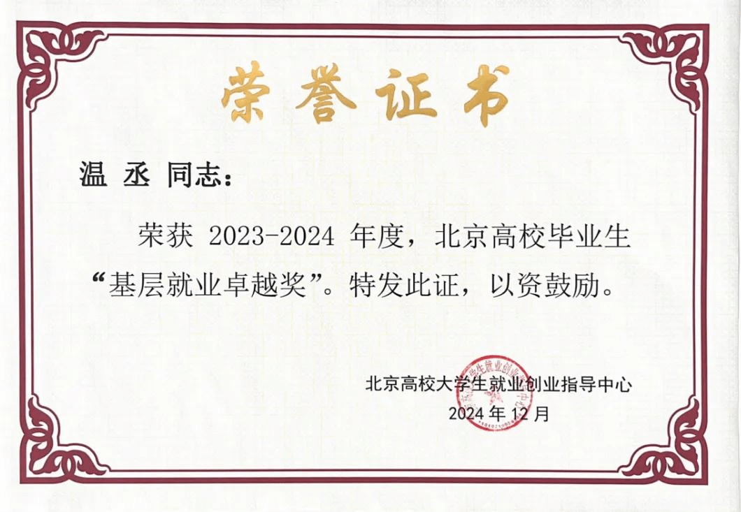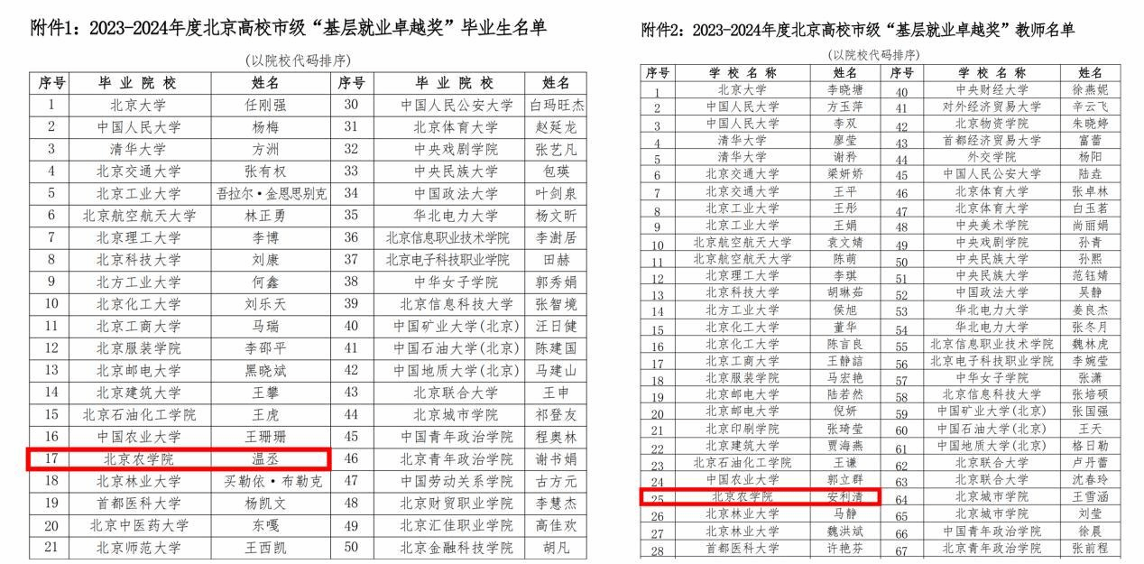 近日,北京市教育委员会、北京高校大学生就业创业指导中心公布2023-2024年度北京高校市级“基层就业卓越奖”获奖名单。我校文法与城乡发展学院2013级毕业生温丞、生物与资源环境学院辅导员安利清老师获评“基层就业卓越奖”。