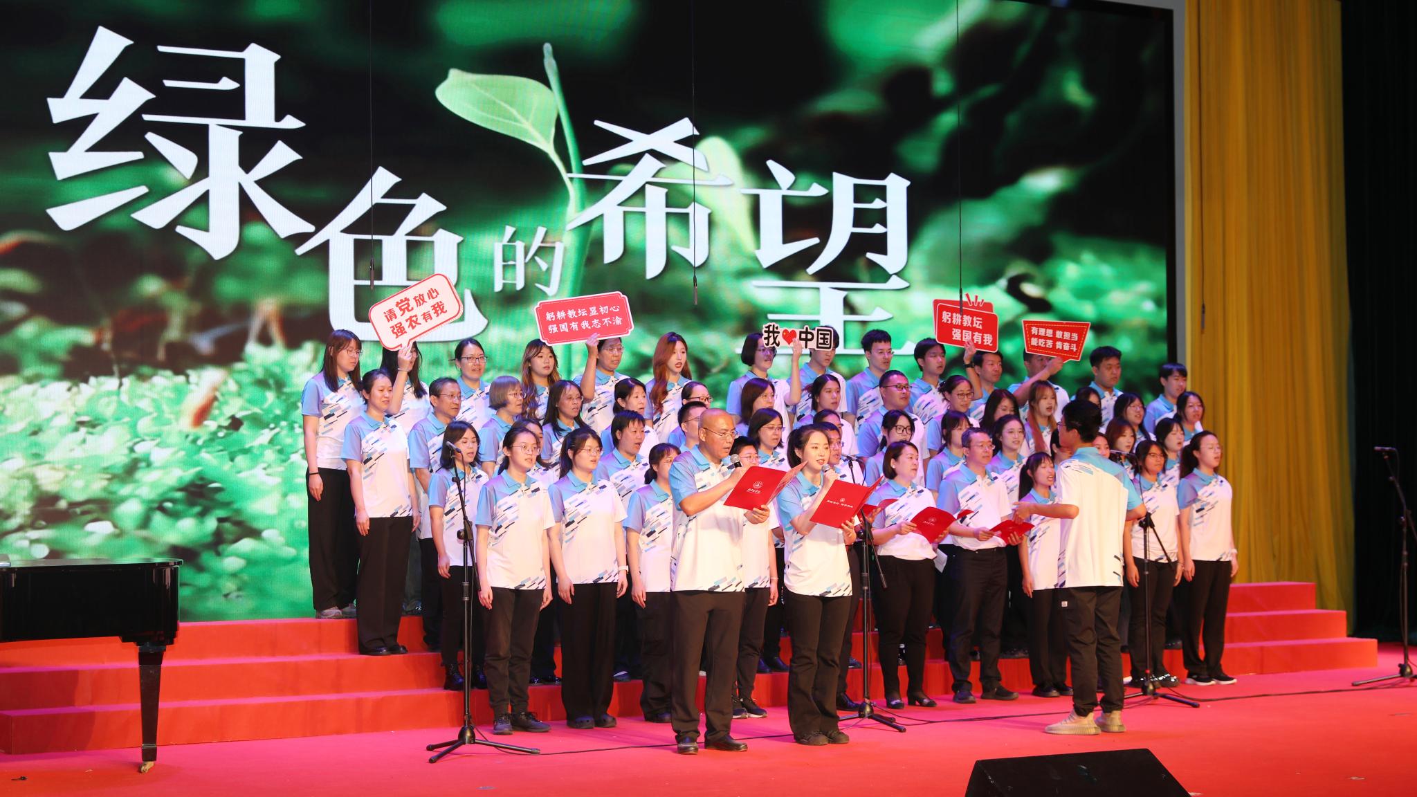 为迎接中华人民共和国成立75周年,大力弘扬爱国主义精神,强化强农兴农使命担当,9月25日下午,学校举办“颂歌献祖国 筑梦新征程”活动,全体校领导与师生共唱歌颂党、歌颂祖国、歌颂人民的经典歌曲和饱含强农兴农、爱校荣校之情的校歌《绿色的希望》。唱出北农人踔厉奋发、勇毅前行的精神风貌,抒发为建设教育强国、农业强国贡献北农力量的壮志豪情。