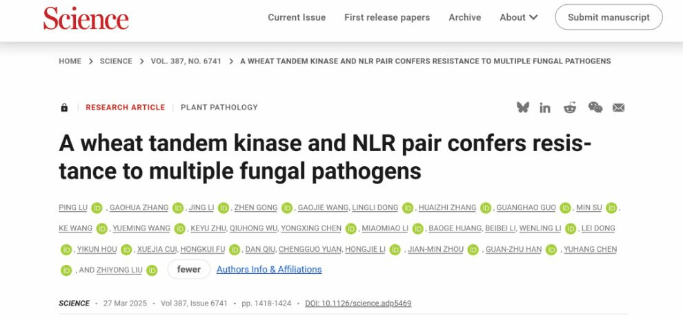 3月28日,中国科学院遗传与发育生物学研究所刘志勇研究员领衔的植物免疫团队联合北京农学院青年教师李晶等人在Science发表题为“A wheat tandem kinase and NLR pair confers resistance to multiple fungal pathogens”的研究论文,揭示了串联激酶抵御病原菌入侵的全新免疫机制:一个非典型的NLR蛋白WTN1(Wheat Tandem NBD 1)与串联激酶WTK3协同识别病原菌的效应蛋白激发免疫反应,表现对多种小麦真菌病害的抗性。该项工作突破了领域内对串联激酶作用机制的认识,发现了串联激酶与传统NLR协同抗病新范式,填补了植物串联激酶免疫调控途径的空白,为作物广谱多抗品种精准设计奠定了理论和应用基础。