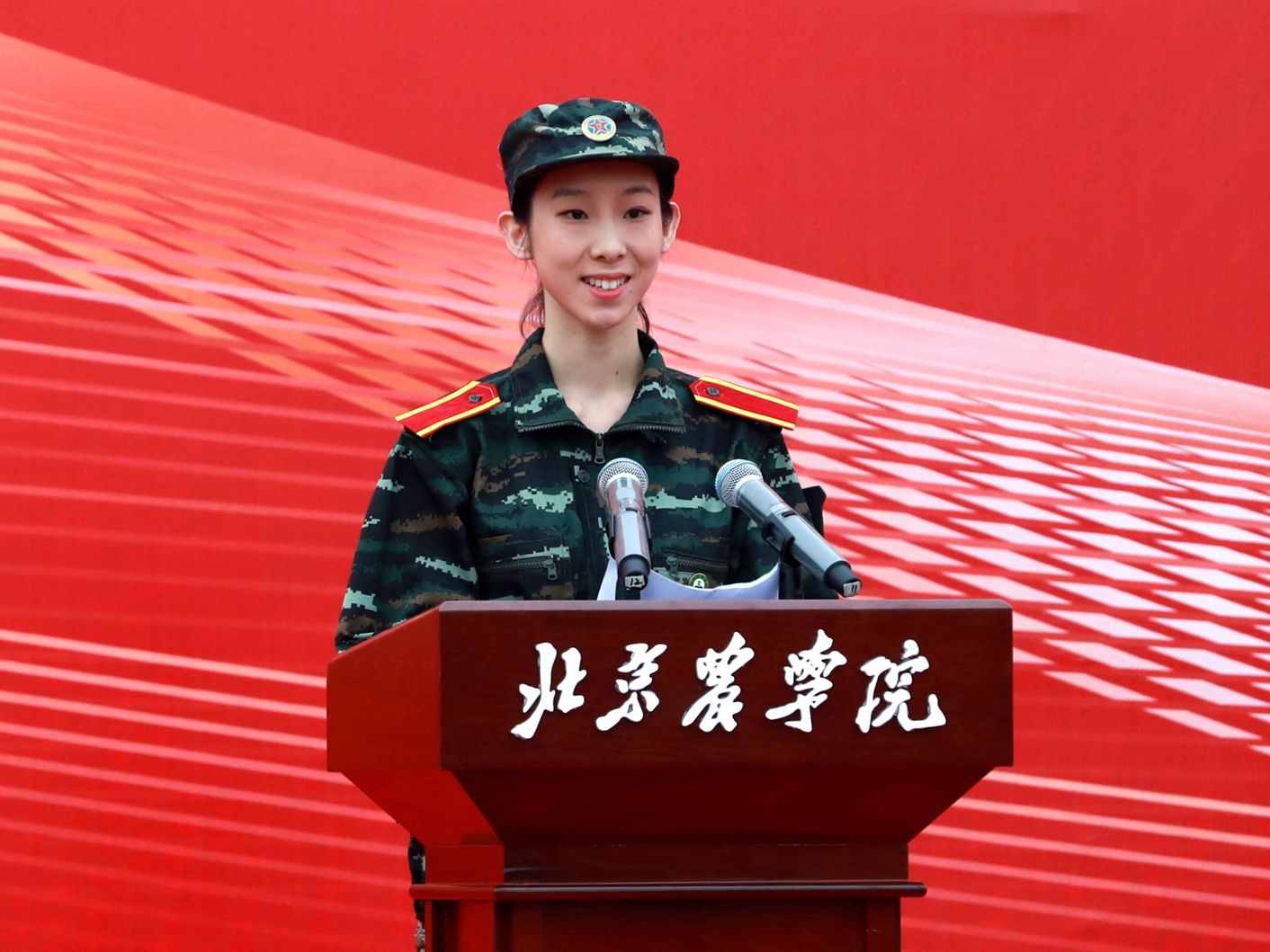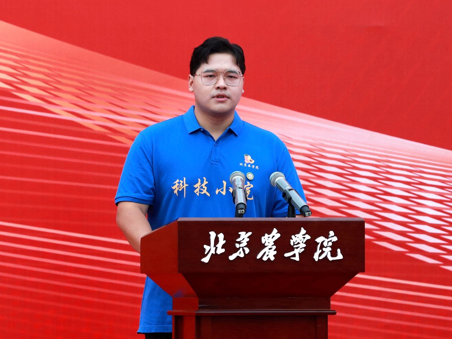 在校生代表、生物与资源环境学院李顺垒分享了自己在平谷区北寨村科技小院开展社会实践、用农业科技帮助果农增产增收的经历和感受,他号召新生一起争做“懂农业、爱农村、爱农民”的新农人,为服务乡村振兴贡献自己的力量。